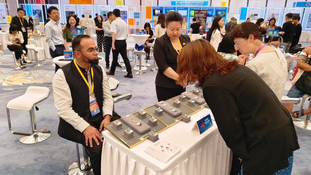 7月8日,第八届进博会消费品展区、服务贸易展区展前供需对接会暨上海招商路演上,外国展商(左一)正在与中国采购商对接。叶宣驿 摄